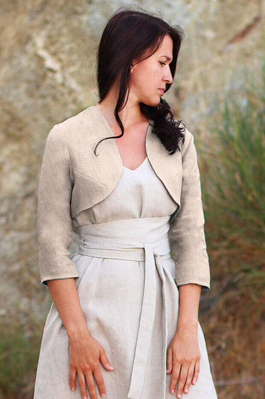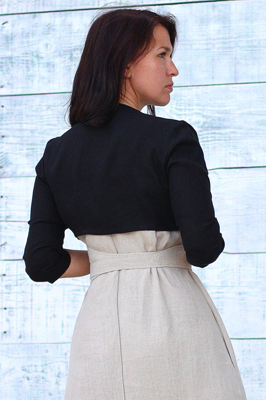 Boleros over a dress from the Czech brand Lotika. Premium linen and hemp fabrics bring softness and sustainability to your wardrobe.