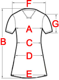 Size | Bust (A) | Length (B) | Waist (C) | Hips (D) | Hem (E) | Shoulders (F) | Sleeves (G) |