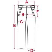 Size | Waist (A) | Hips (B) | Thighs (C) | Bottom (D) | Length (E) | Height (F) |